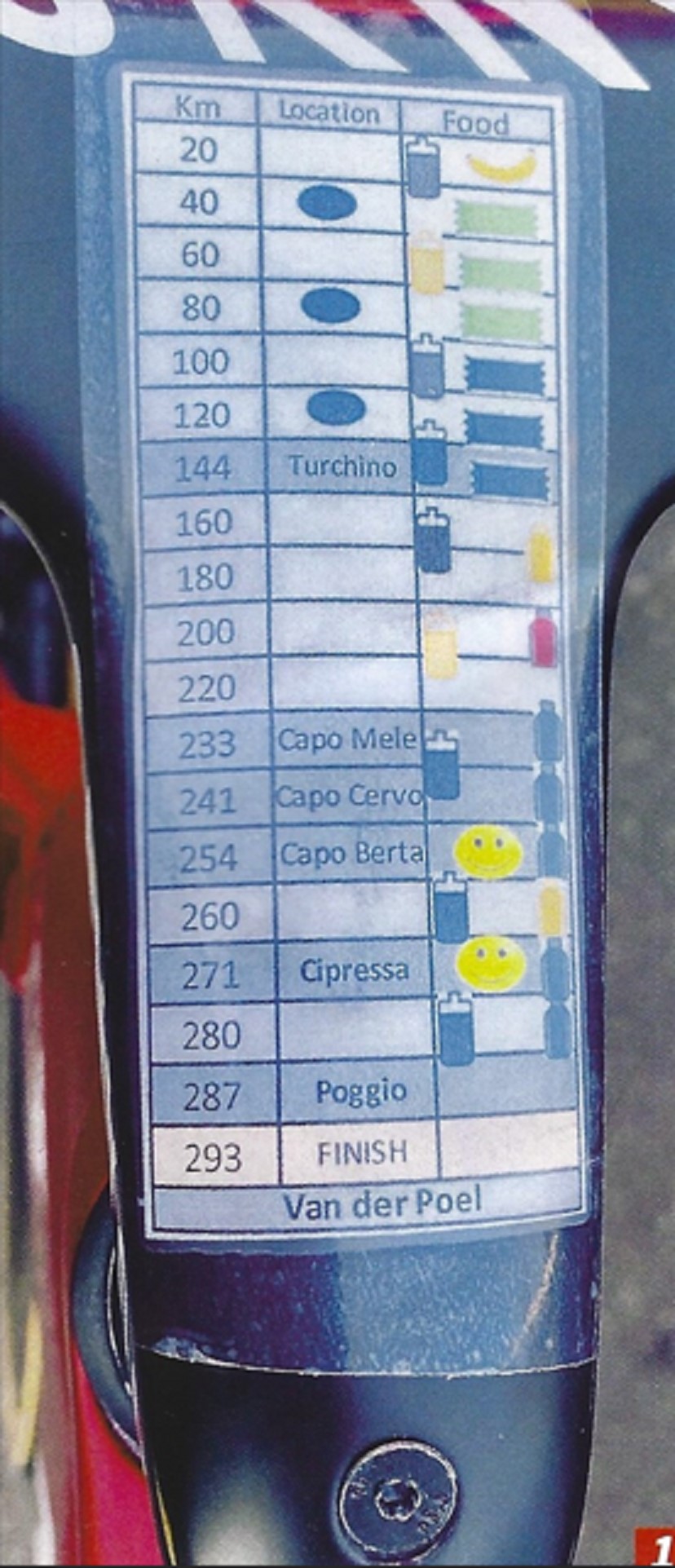 Per avere un esempio pratico, questo è lo schema alimentare di Mattieu Van der Poel durante una vittoriosa Milano-Sanremo, così come era sul manubrio della sua bicicletta: